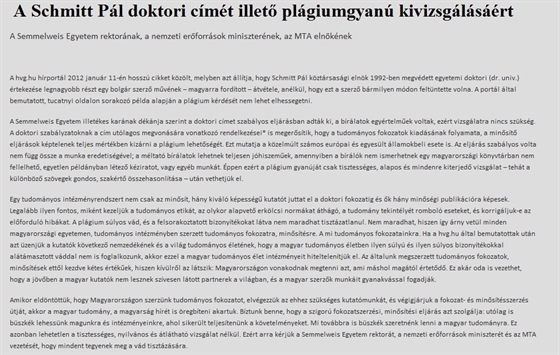 A beadványban továbbá az áll, mivel a plágium súlyos vád, a felsorakoztatott bizonyítékokat látva nem maradhat tisztázatlanul. „Nem maradhat, hiszen így árny vetül minden magyarországi egyetemen, tudományos intézményben szerzett tudományos fokozatra, minősítésre. A mi tudományos fokozatainkra. Ha a hvg.hu által bemutatottak után azt üzenjük a kutatók következő nemzedékének és a világ tudományos életének, hogy a magyar tudományos életben ilyen súlyú és ilyen súlyos bizonyítékokkal alátámasztott váddal nem is foglalkozunk, akkor ezzel a magyar tudományos élet intézményeit hiteltelenítjük el” – vélik.
