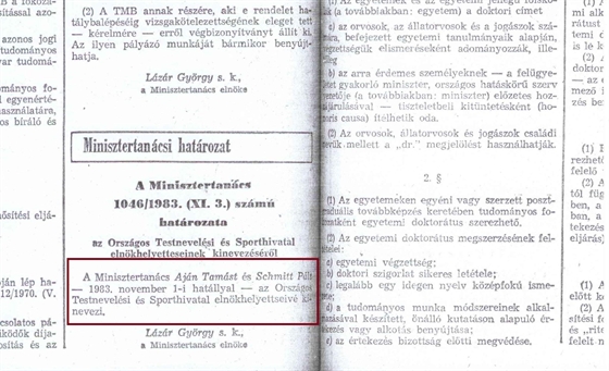 A sors furcsa iróniája, hogy az 1983-as Magyar Közlönyben a tudományos fokozatokról szóló minisztertanácsi rendelet és az egyetemi doktorátusról szóló művelődési miniszteri rendelet közé ékelődve található az az – MSZMP KB Titkársága, azaz többek között Kádár János és Szűrös Mátyás hozzájárulását igénylő – minisztertanácsi határozat, melyben Schmitt Pált a sportot irányító központi hatóság, az Országos Testnevelési és Sporthivatal (OTSH) elnökhelyettesévé nevezték ki. Schmitt miniszterhelyettesi rangú állami vezetőként volt a hivatal egyik vezetője.